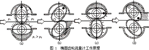典型的PDF(橢圓齒輪式)的工作原理如圖1所示。兩個(gè)橢圓齒輪具有相互滾動(dòng)進(jìn)行接觸旋轉的特殊形狀。P1和p2分別表示入口壓力和出口壓力,顯然p1>p2,圖1(a)下方齒輪在兩側壓力差的作用下,產(chǎn)生逆時(shí)針?lè )较蛐D,為主動(dòng)輪;上方齒輪因兩側壓力相等,不產(chǎn)生旋轉力矩,是從動(dòng)輪,由下方齒輪帶動(dòng),順時(shí)針?lè )较蛐D。在圖1(b)位置時(shí),兩個(gè)齒輪均在差壓作用下產(chǎn)生旋轉力矩,繼續旋轉。選裝到圖1(c)位置時(shí),上方齒輪變?yōu)橹鲃?dòng)輪,下方齒輪則成為從動(dòng)輪,繼續旋轉到與圖1(a)相同位置,完成一個(gè)循環(huán)。一次循環(huán)動(dòng)作排出四個(gè)由齒輪與殼壁間圍成的新月形空腔的流體體積,該體積稱(chēng)作流量計的"循環(huán)體積"。